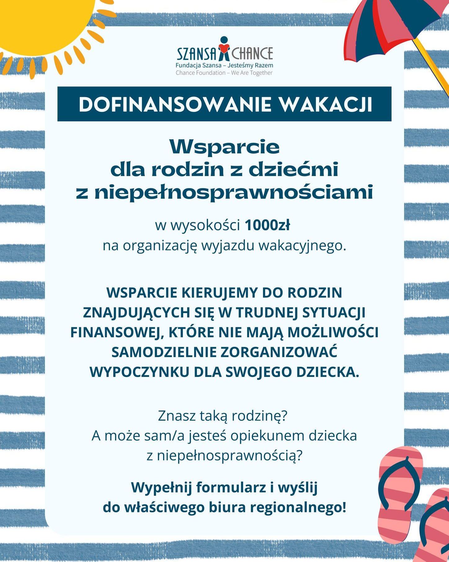 Fundacja Szansa rozpoczęła realizację ogólnopolskiej akcji pomocowej „1000 zł na wakacje”, której celem jest wsparcie rodzin wychowujących dzieci z niepełnosprawnością – w szczególności niepełnosprawnością wzroku – poprzez przekazanie jednorazowej darowizny w wysokości 1 000 zł.